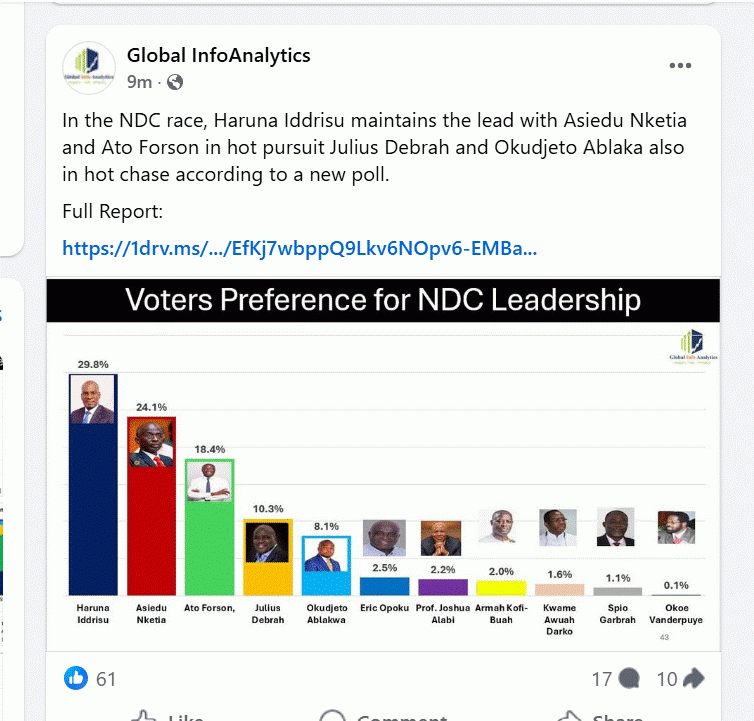 A new poll conducted by Global InfoAnalytics has placed Education Minister, Haruna Iddrisu, ahead in the race for the National Democratic Congress (NDC) leadership.