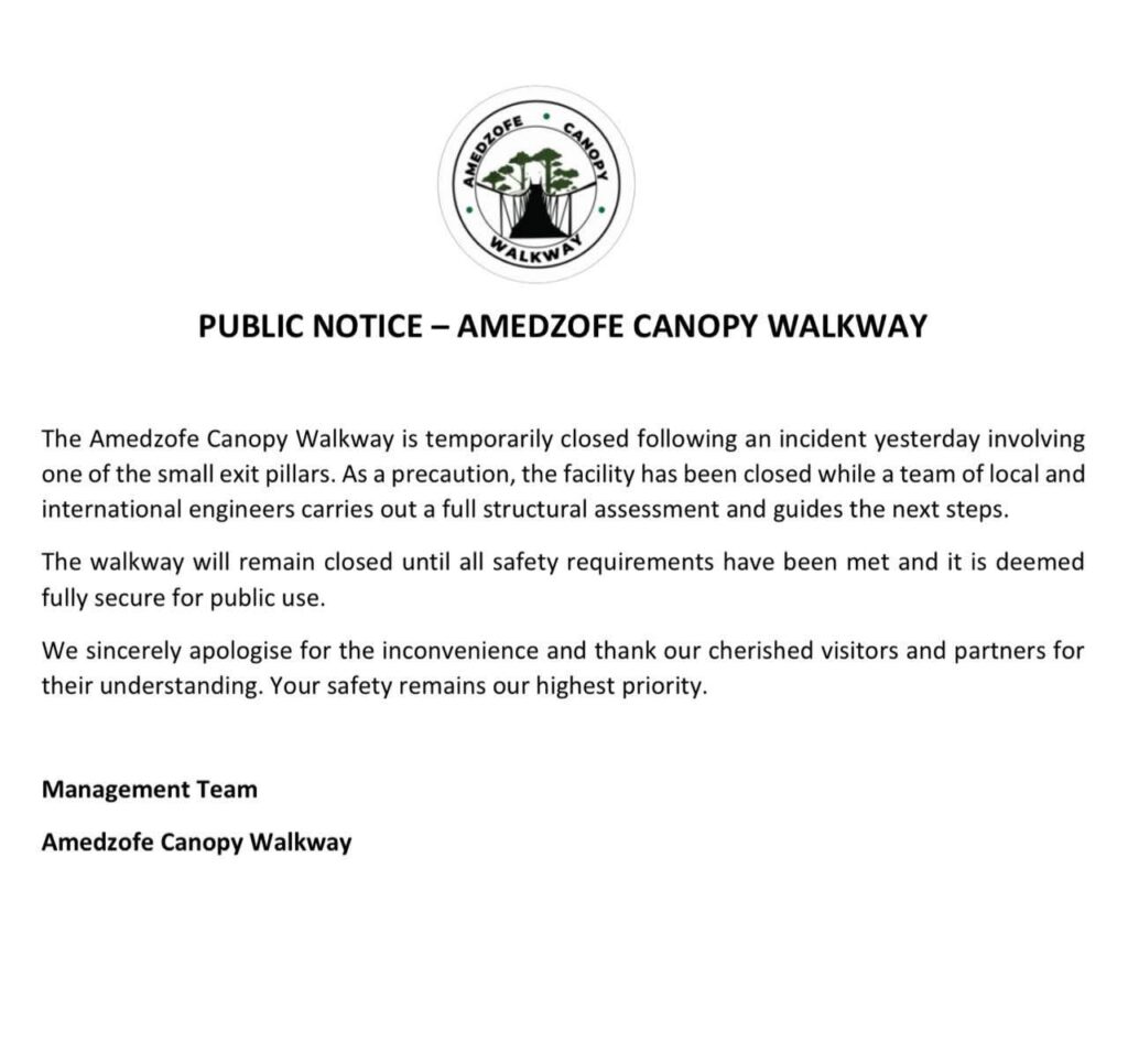 The management of the Amedzofe Canopy Walkway in the Ho West District of the Volta Region has announced the temporary closure of the facility following an incident involving one of its small exit pillars on Thursday, December 4,2025.