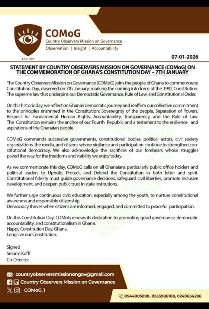 The organization reaffirmed its commitment to promoting good governance, constitutionalism, and democratic accountability across the country, while extending well wishes to Ghanaians on the observance of Constitution Day.