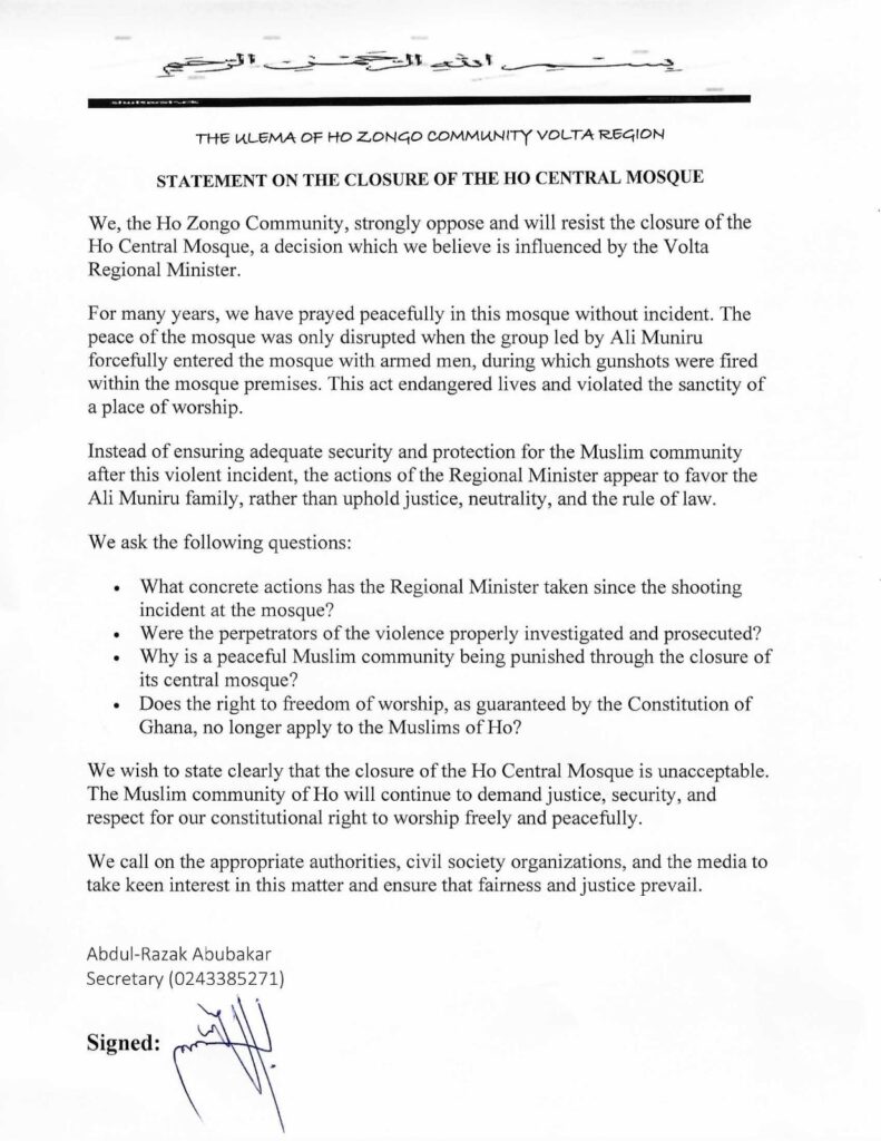 The statement was signed by the Secretary of the Ho Zongo Community Ulema, Abdul-Razak Abubakar.