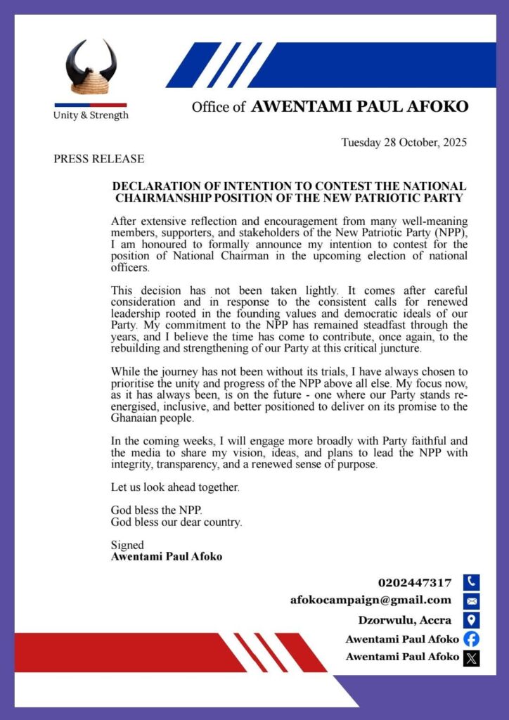 A former National Chairman of the New Patriotic Party (NPP), Mr. Awentami Paul Afoko, has officially declared his intention to contest for the position of National Chairman in the party’s upcoming national officers’ election.