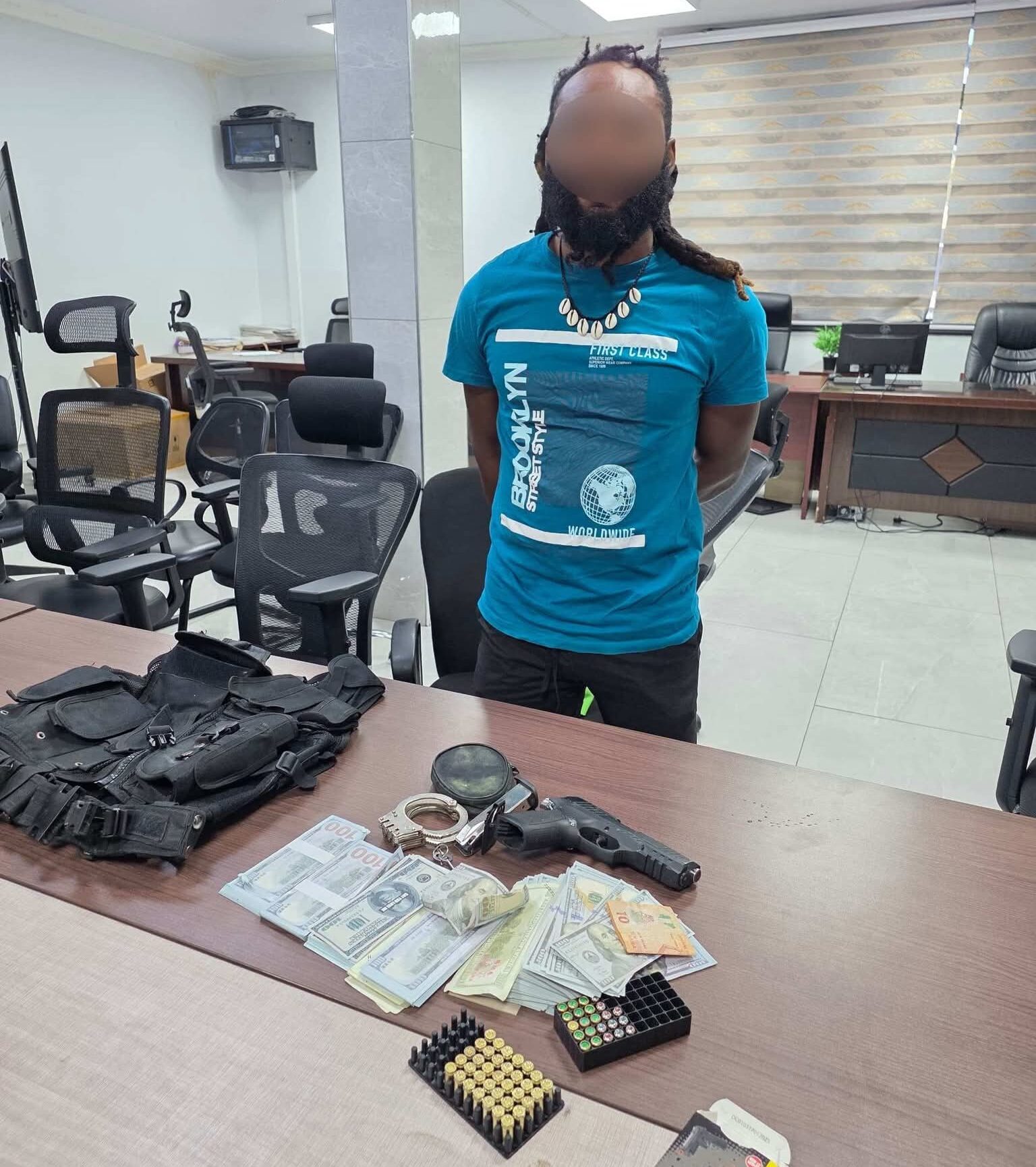 The suspect, identified as Josiah Elorm Kwame Amezado, was picked up at his residence. A search conducted in his room led to the retrieval of quantities of US dollar notes in one-hundred-dollar denominations, a pair of handcuffs, a black vest, a Kuzey A100 blank pistol, and fifty-eight 9mm blank ammunition.