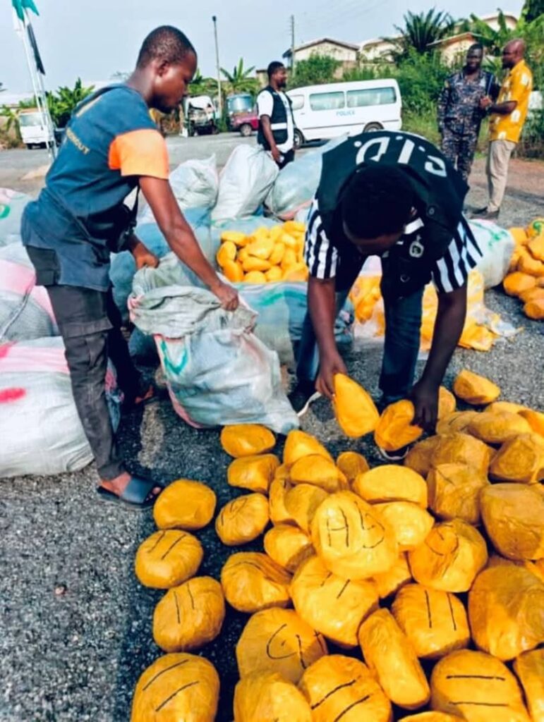 A search conducted in the presence of the suspect, identified as 38-year-old Godsway Kwaku Dogbey of the Ghana Health Service Directorate in Ho, revealed 26 maxi sacks containing 2,045 compressed yellow oval-shaped wraps of leaves suspected to be Indian hemp. Police estimate the street value at GH¢1,022,500.00.