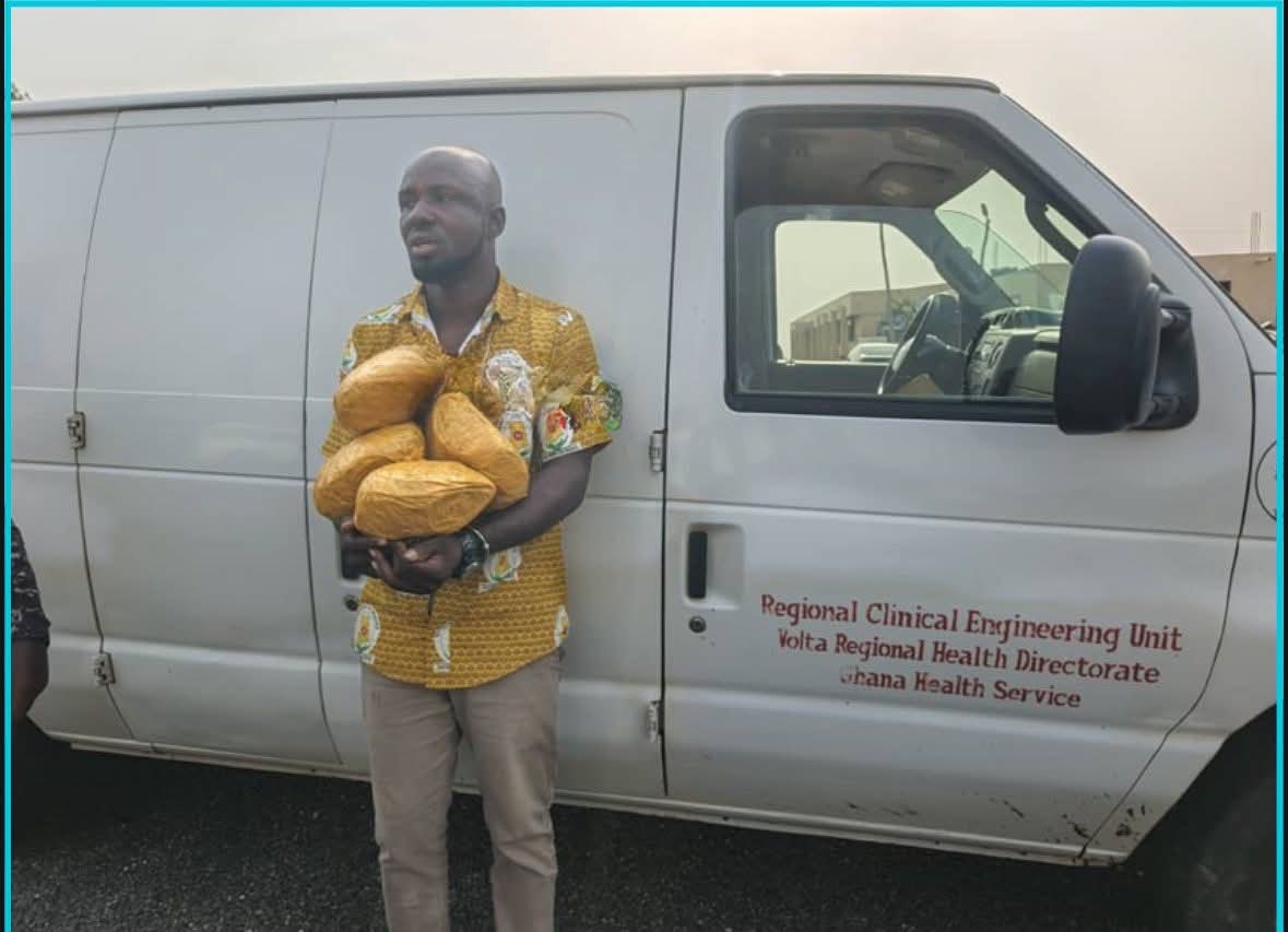 A search conducted in the presence of the suspect, identified as 38-year-old Godsway Kwaku Dogbey of the Ghana Health Service Directorate in Ho, revealed 26 maxi sacks containing 2,045 compressed yellow oval-shaped wraps of leaves suspected to be Indian hemp. Police estimate the street value at GH¢1,022,500.00.